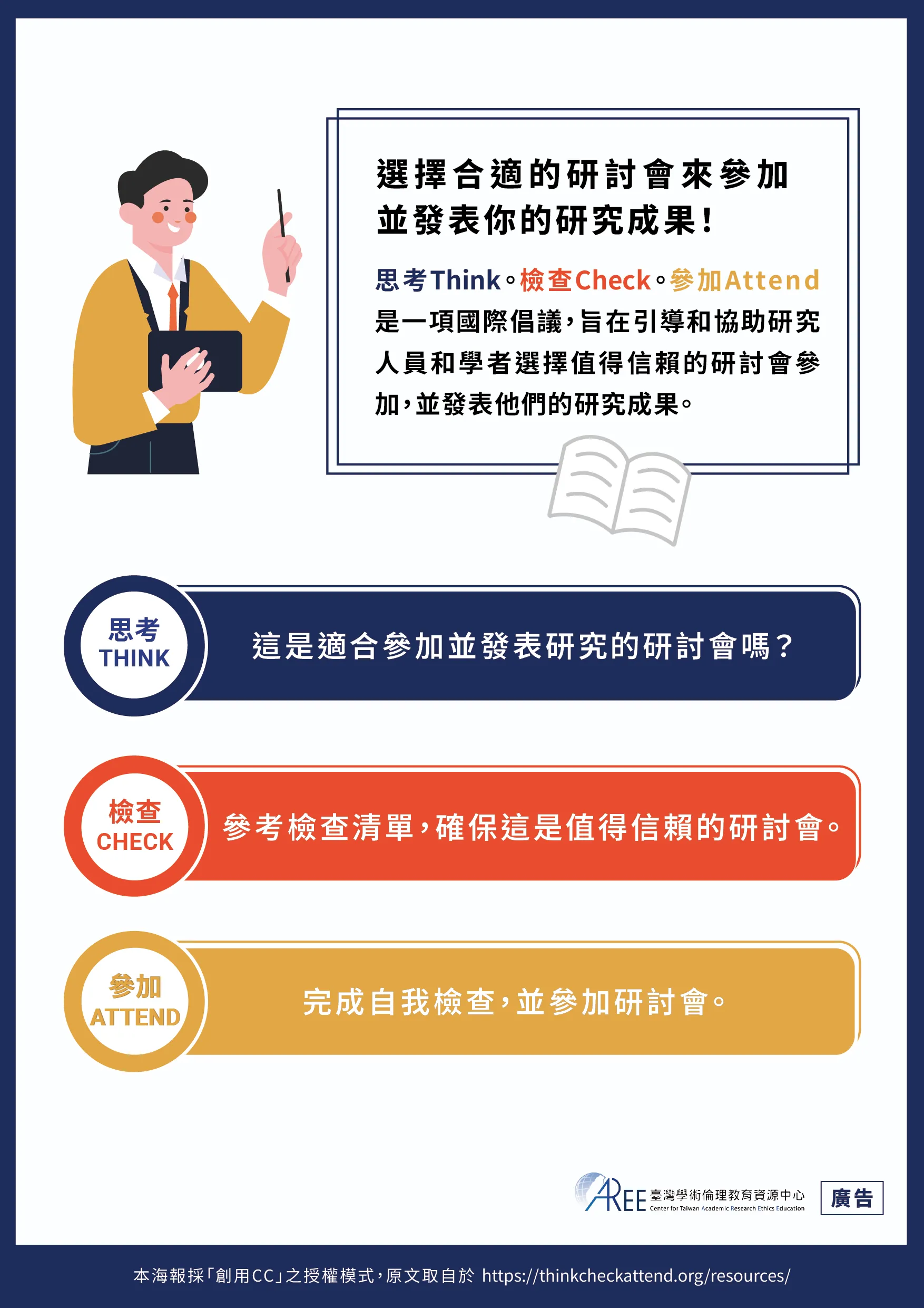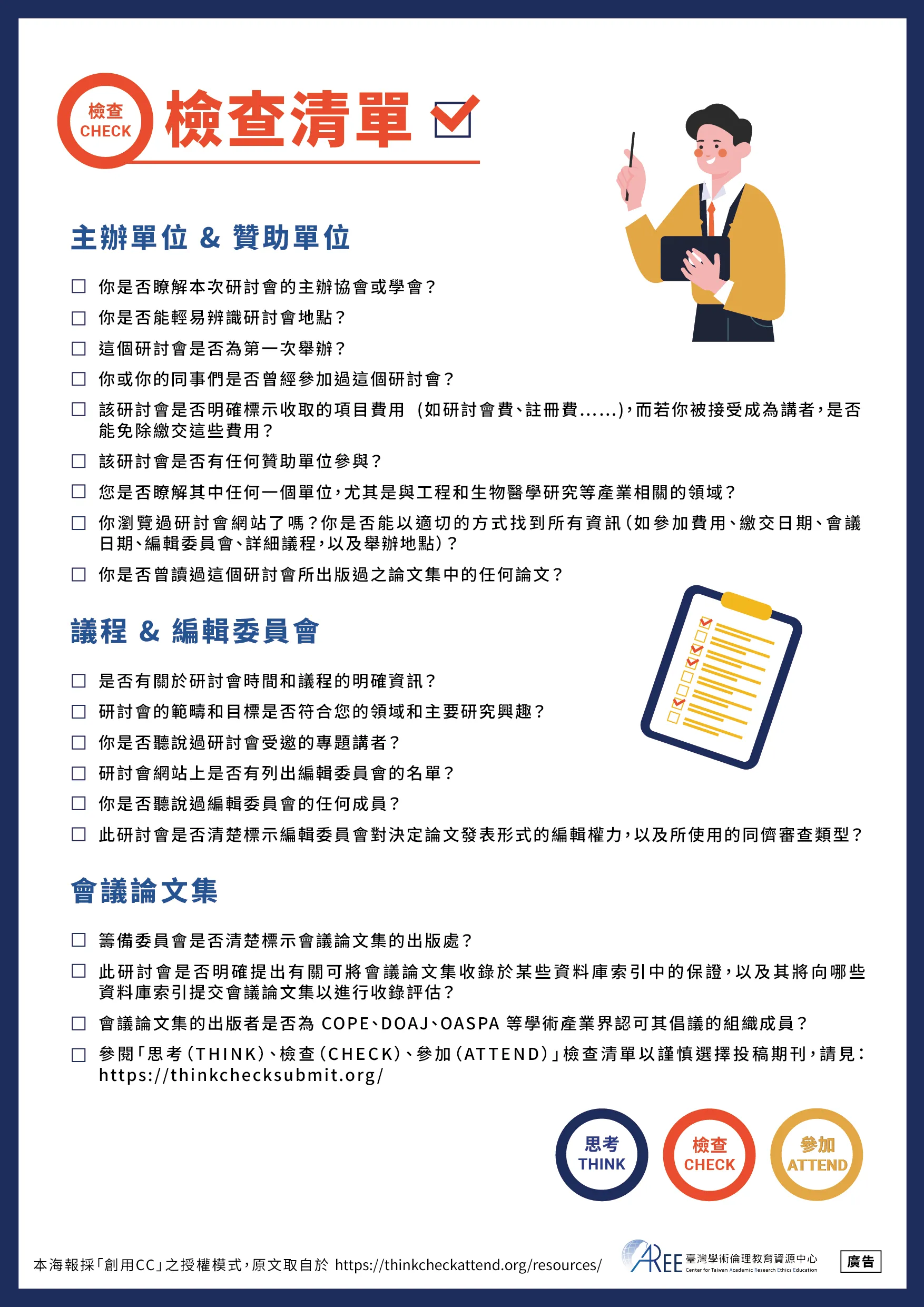 教育部臺灣學術倫理教育資源中心( 2024)掠奪性會議之思考、檢查、參加檢查步驟〔海報〕。