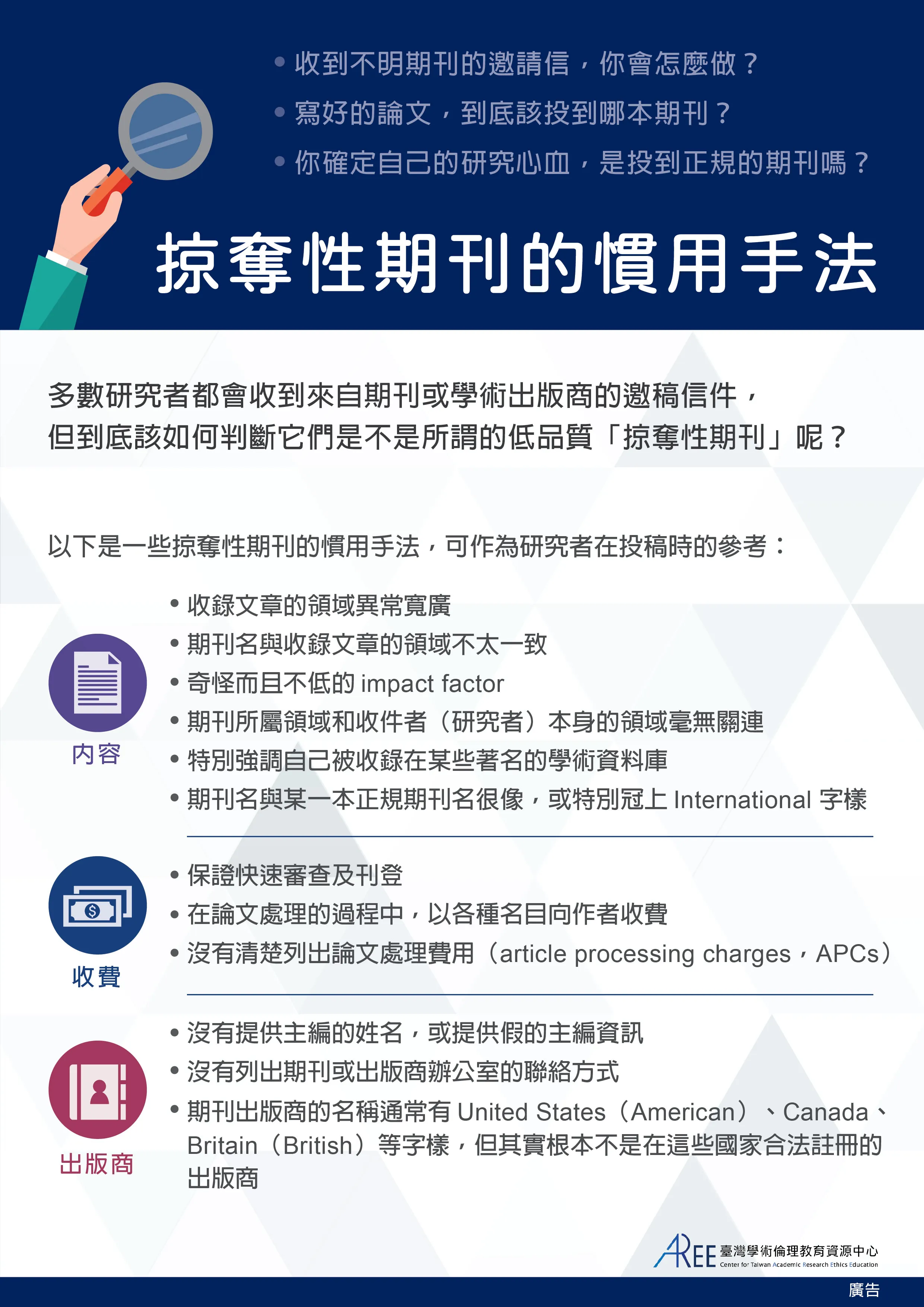 教育部臺灣學術倫理教育資源中心( 2022)掠奪性期刊的慣用手法〔海報〕。