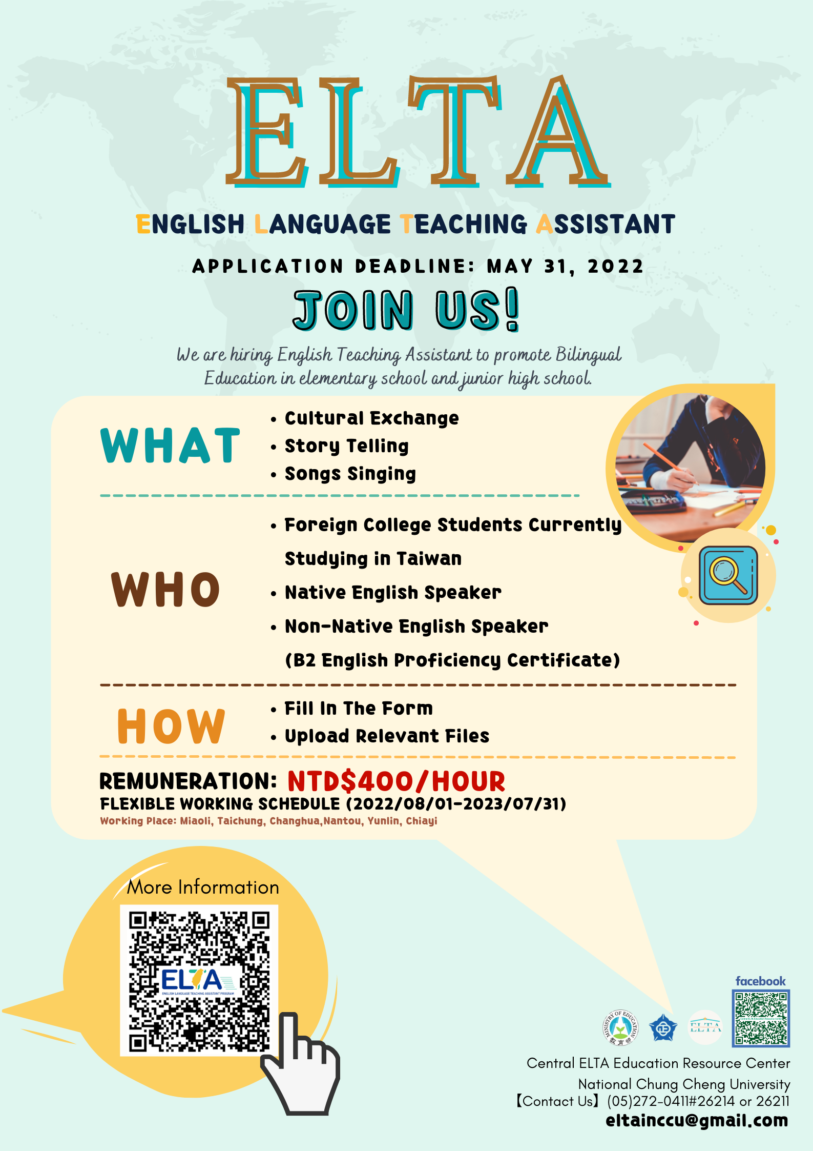 二、本案申請資格、工作說明、薪資及相關福利詳如附件,報名網站:https://tfetp.epa.ntnu.edu.tw/en/elta/web/home。本案倘有疑義,請洽國民及學前教育署阮小姐,電話:02-7736-7770,電子信箱:e-j414@mail.k12ea.gov.tw。