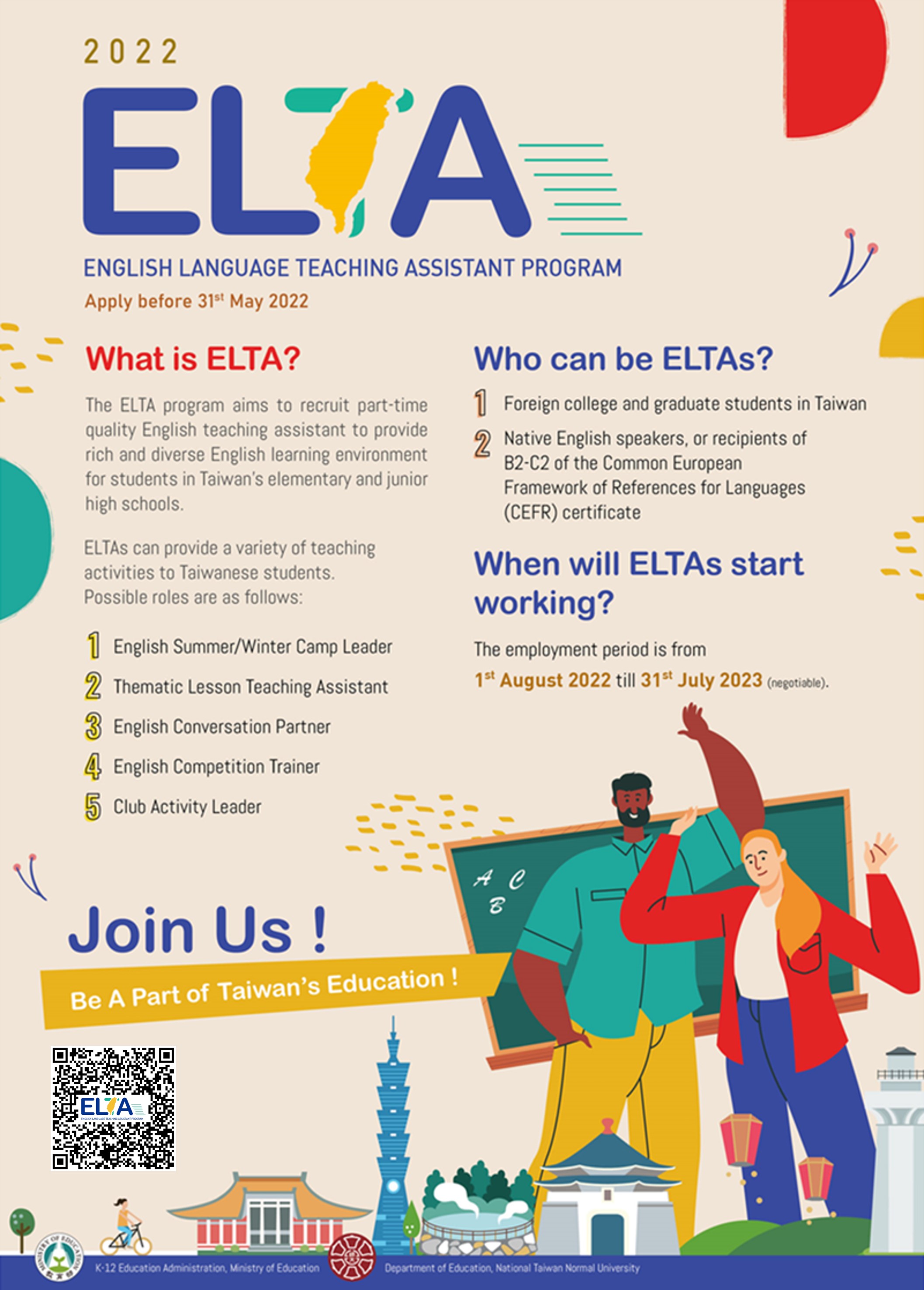 一、為落實2030雙語政策、提升學生英語口說能力及營造校園英語生活情境,本部國民及學前教育署自110年起辦理「擴大引進外籍英語教學人員計畫」,並增辦「協助公立國民中小學引進部分工時外籍英語教學助理計畫」(English Language Teaching Assistant,ELTA),自111年4月1日起開始對外招募。