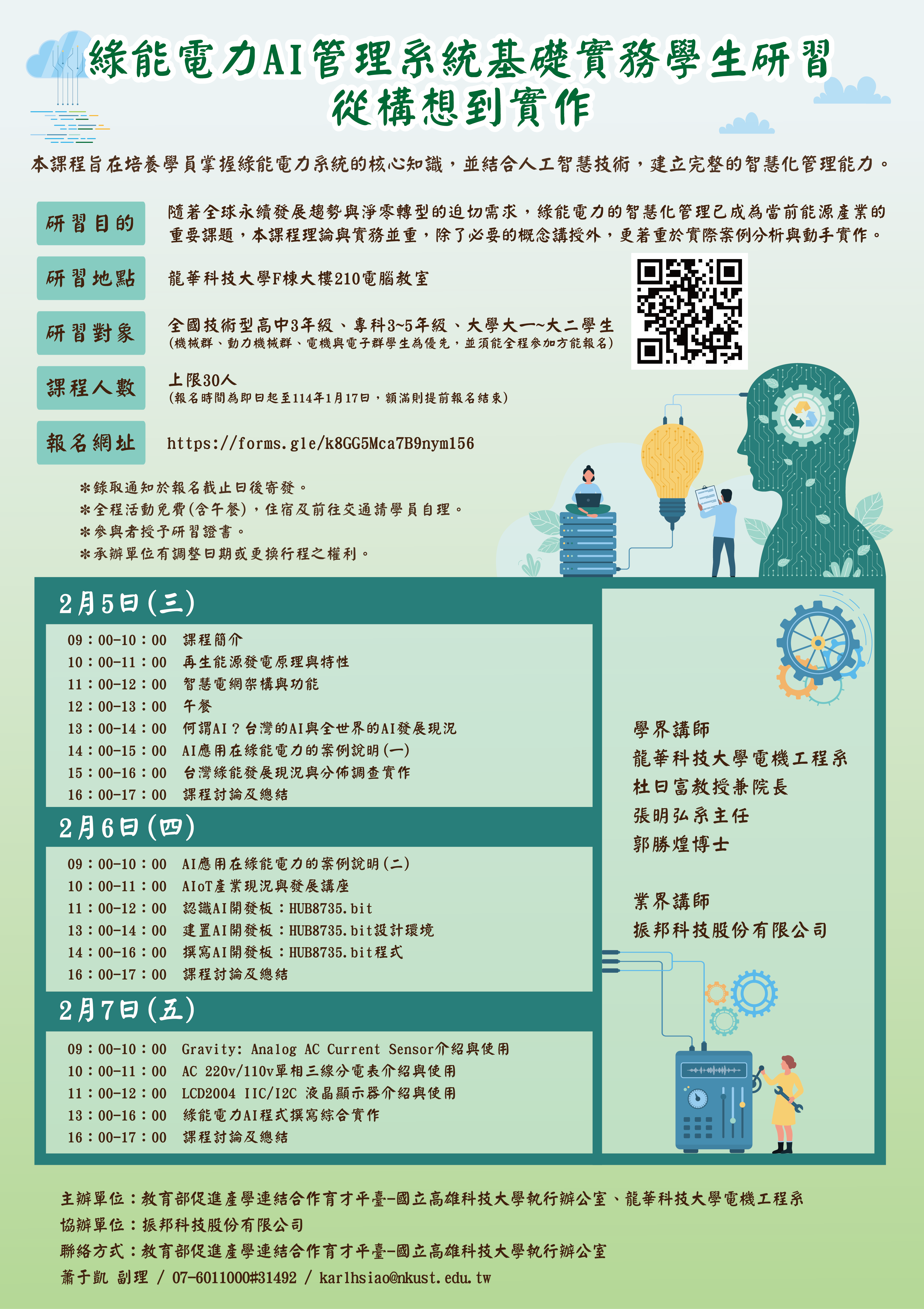 一、本課程旨在培養學員掌握綠能電力系統的核心知識,並結合人工智慧技術,建立完整的智慧化管理能力。