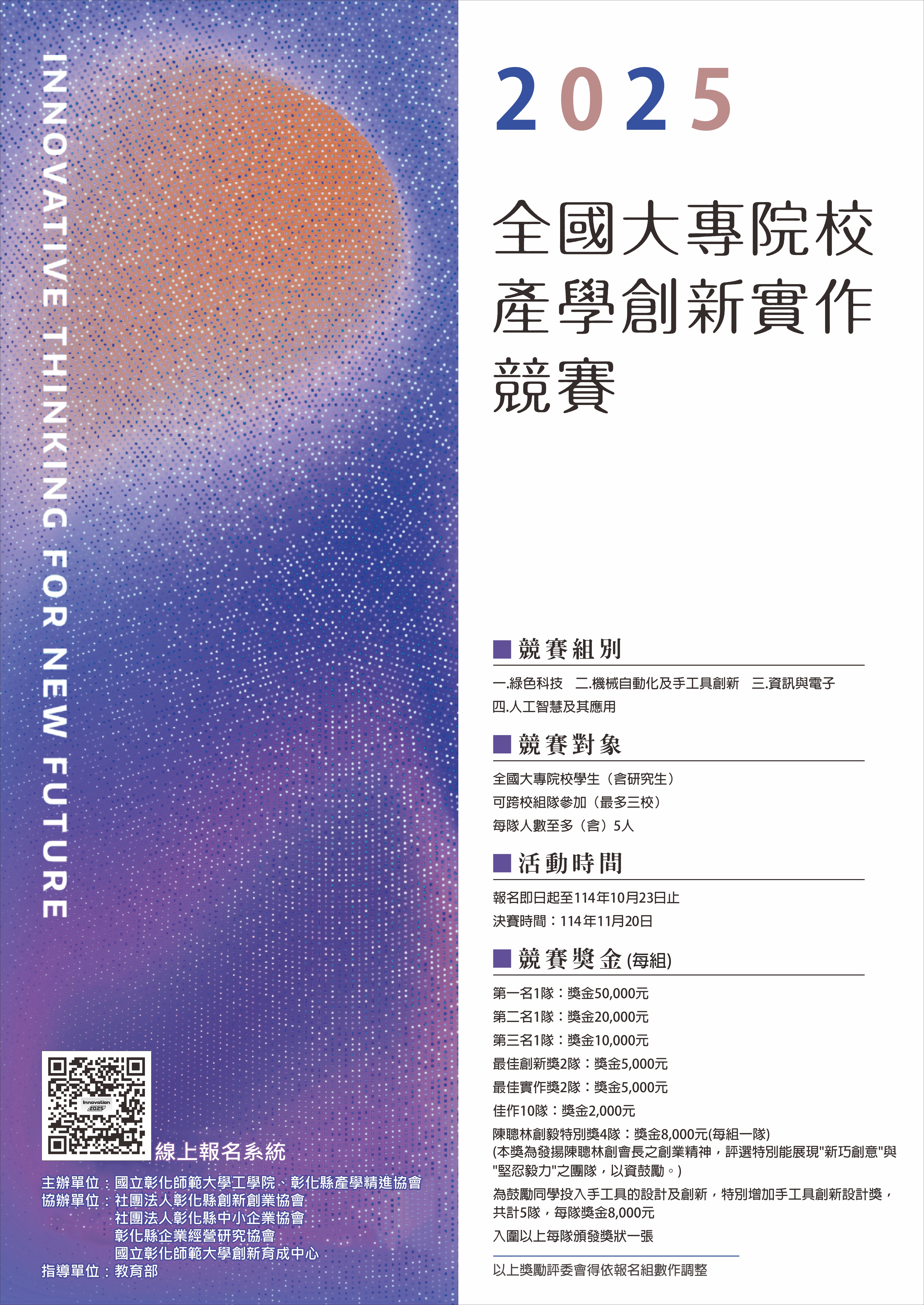 轉知國立彰化師範大學辦理「2025全國大專院校產學創新實作競賽」海報,敬請惠予公告,並鼓勵本校師生報名參加,請查照。