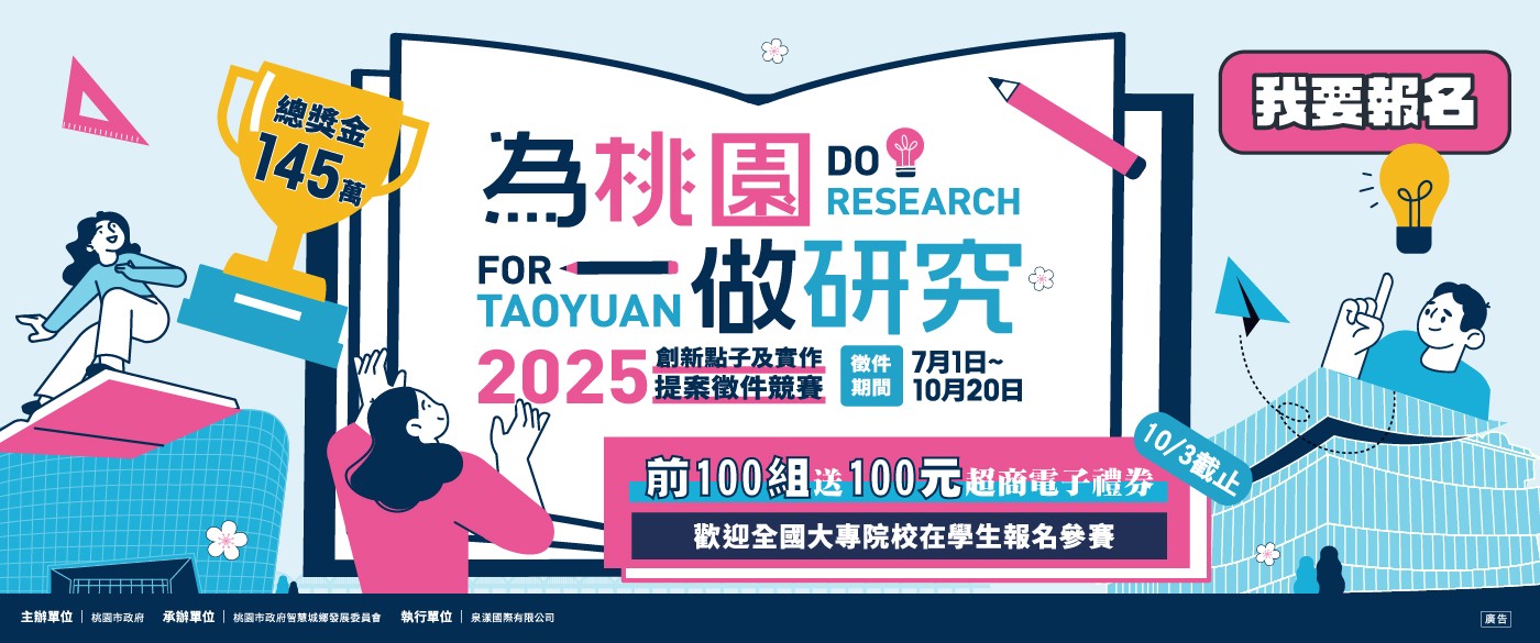 轉知桃園市政府邀請本校參加「為桃園做研究」桃園市政府大專校院學生創新點子及研究實作競賽,請踴躍報名並廣為宣傳,請查照。