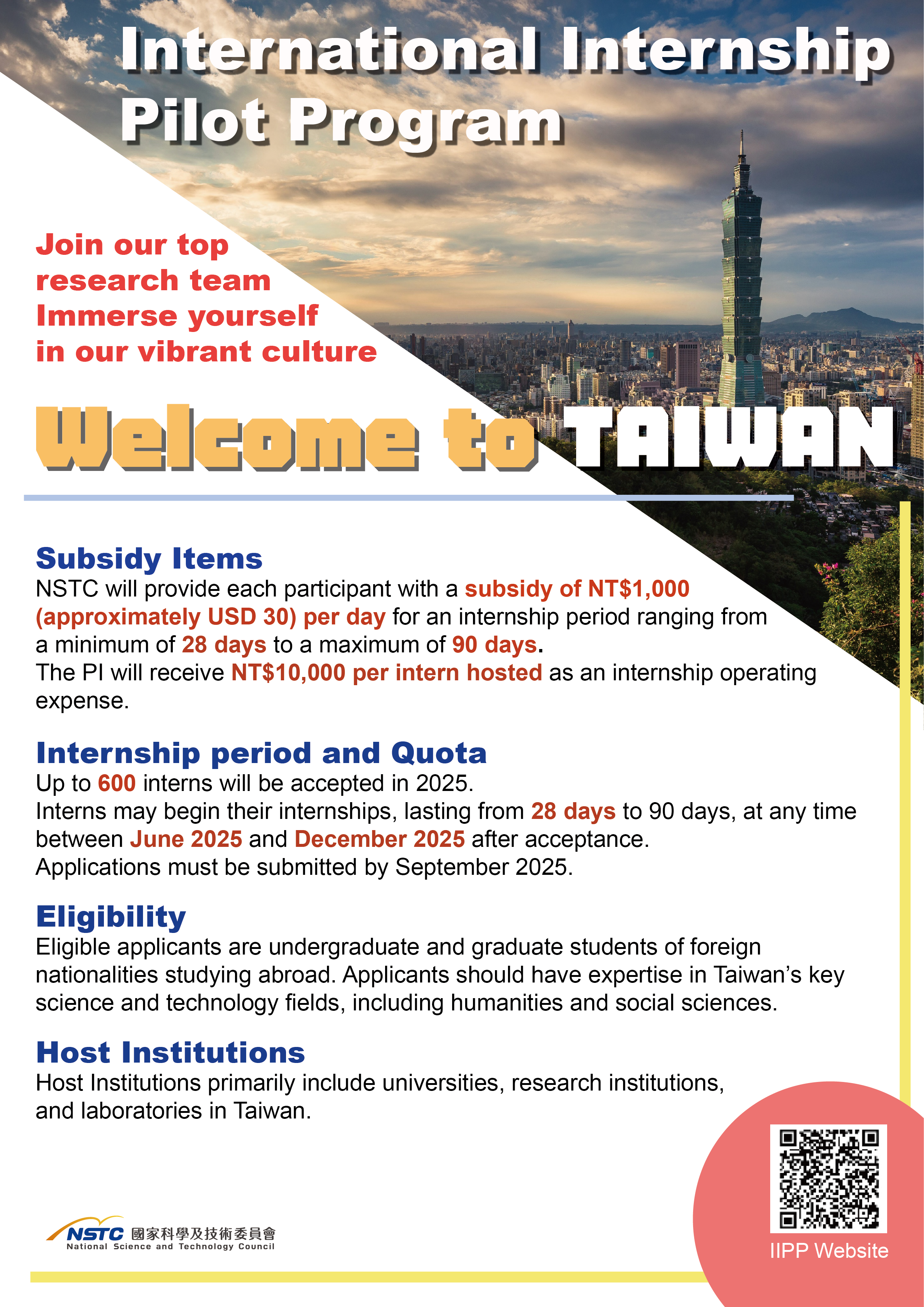 財團法人國家實驗研究院受國科會委託辦理「114年外籍高階人才來臺實習專案(IIPP)」,專案規劃內容重點如次: